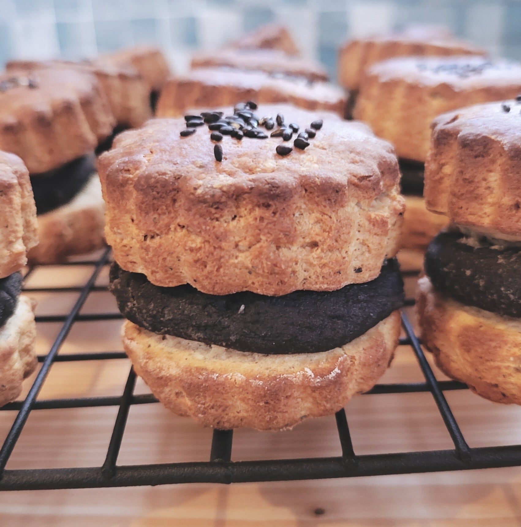 きな粉風味のクリスピー生地に黒ゴマ餡を挟んで焼き上げました。